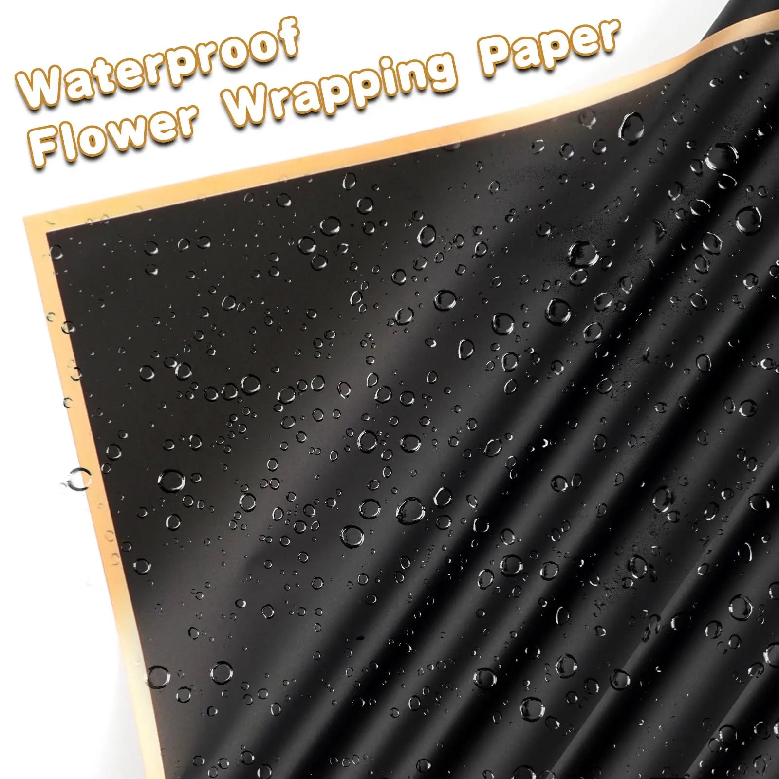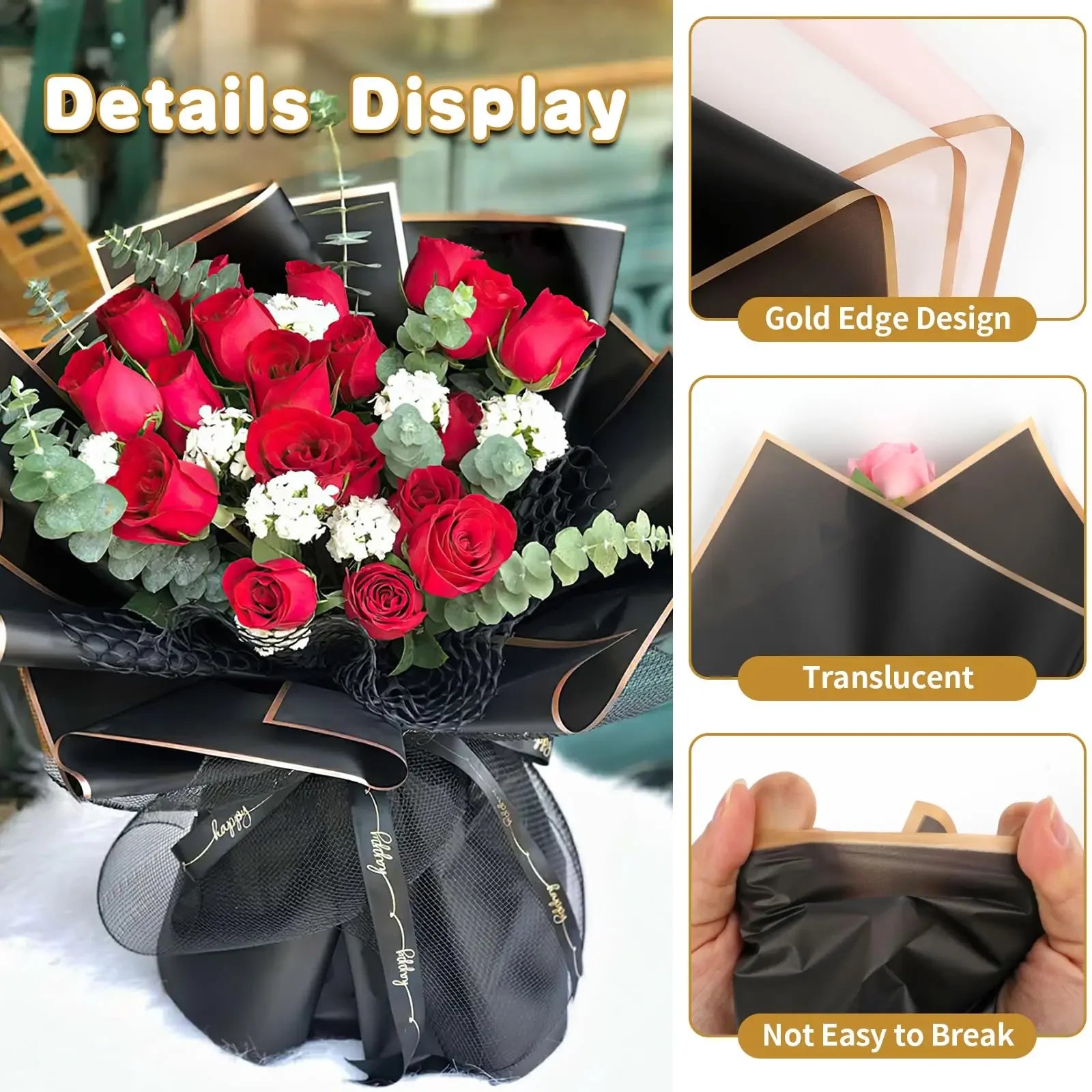 20 Sheets Black Flower Wrapping Paper with Golden Edges, Korean Florist Bouquet Supplies, Waterproof Packaging, Great for DIY Cr