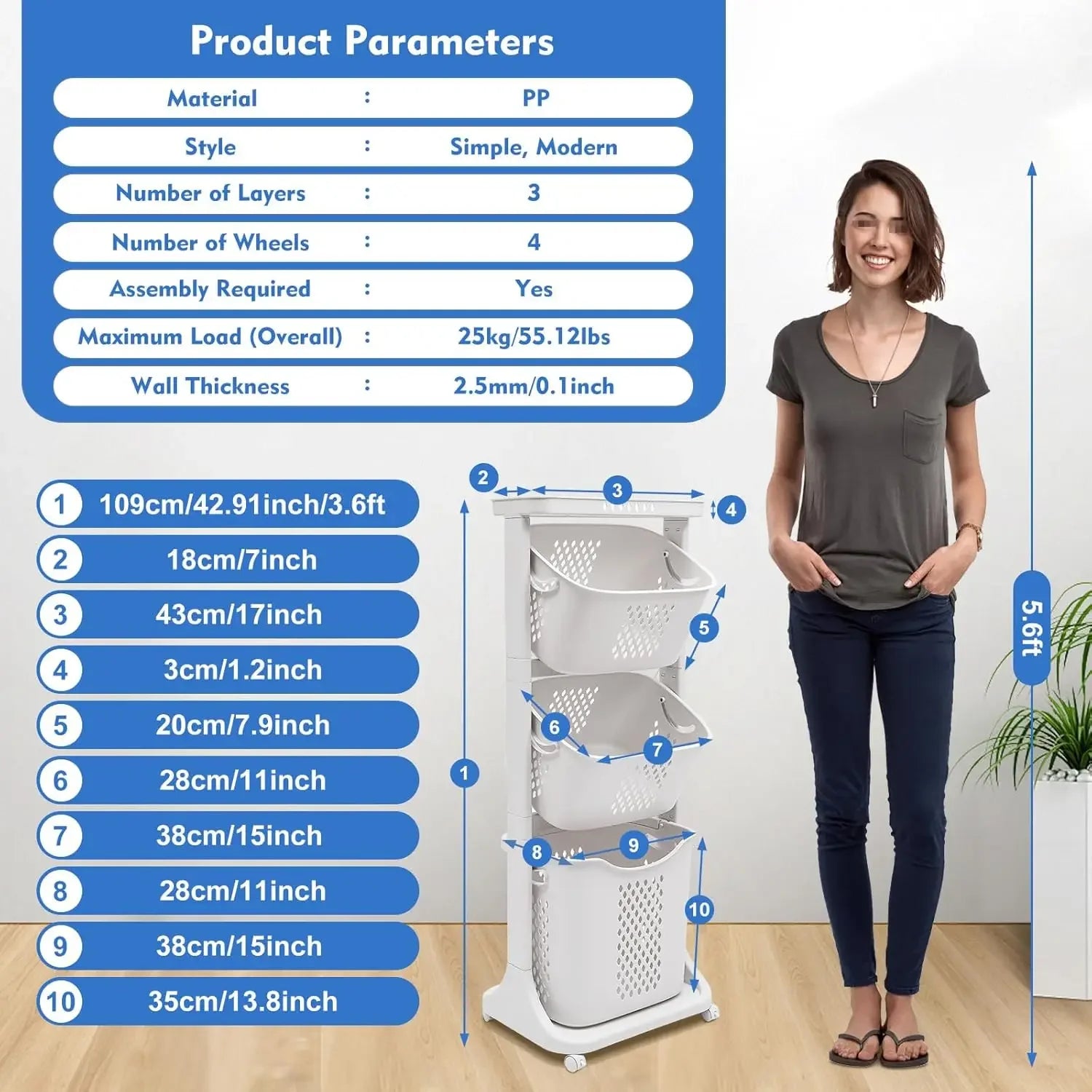 3-Tier Storage Basket Laundry Basket Rolling Cart Washing Hamper Storage Bin Shelf Multifunctional rotating laundry basket