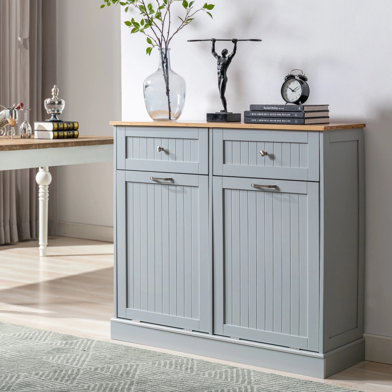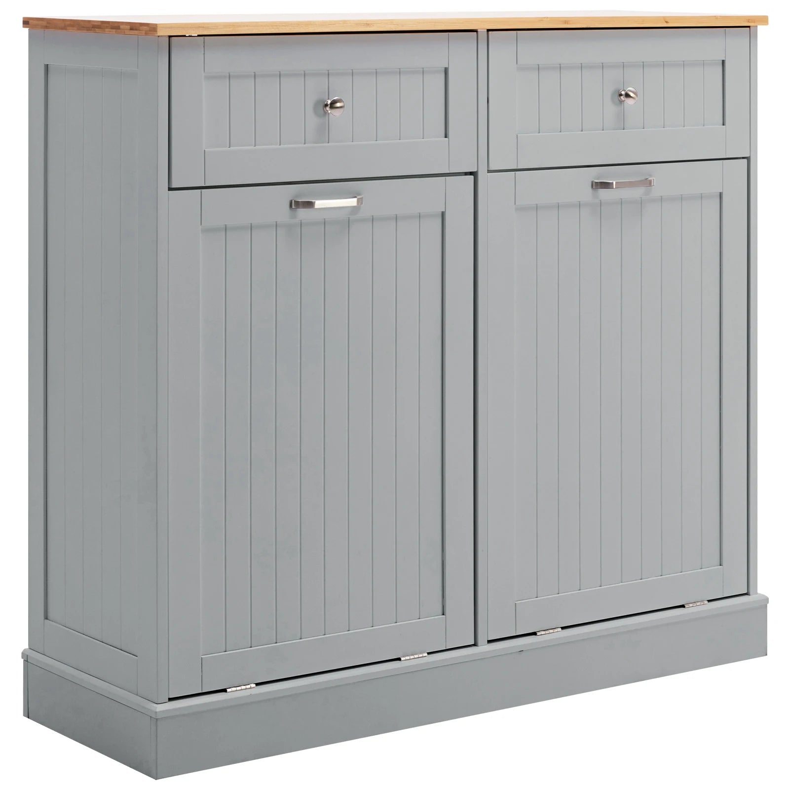 Double Tilt Out Trash Cabinet 20 Gallon, Freestanding Wooden Kitchen Trash Recycling Cabinet with Drawer & Removable Cutting Boa