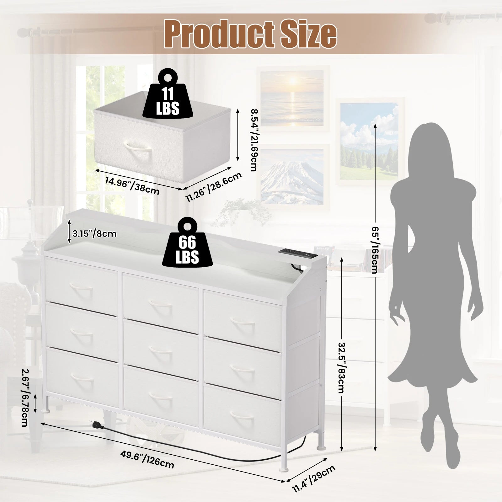 Dresser for Bedroom, 9 Drawers with LED Lights & Charging Station-White