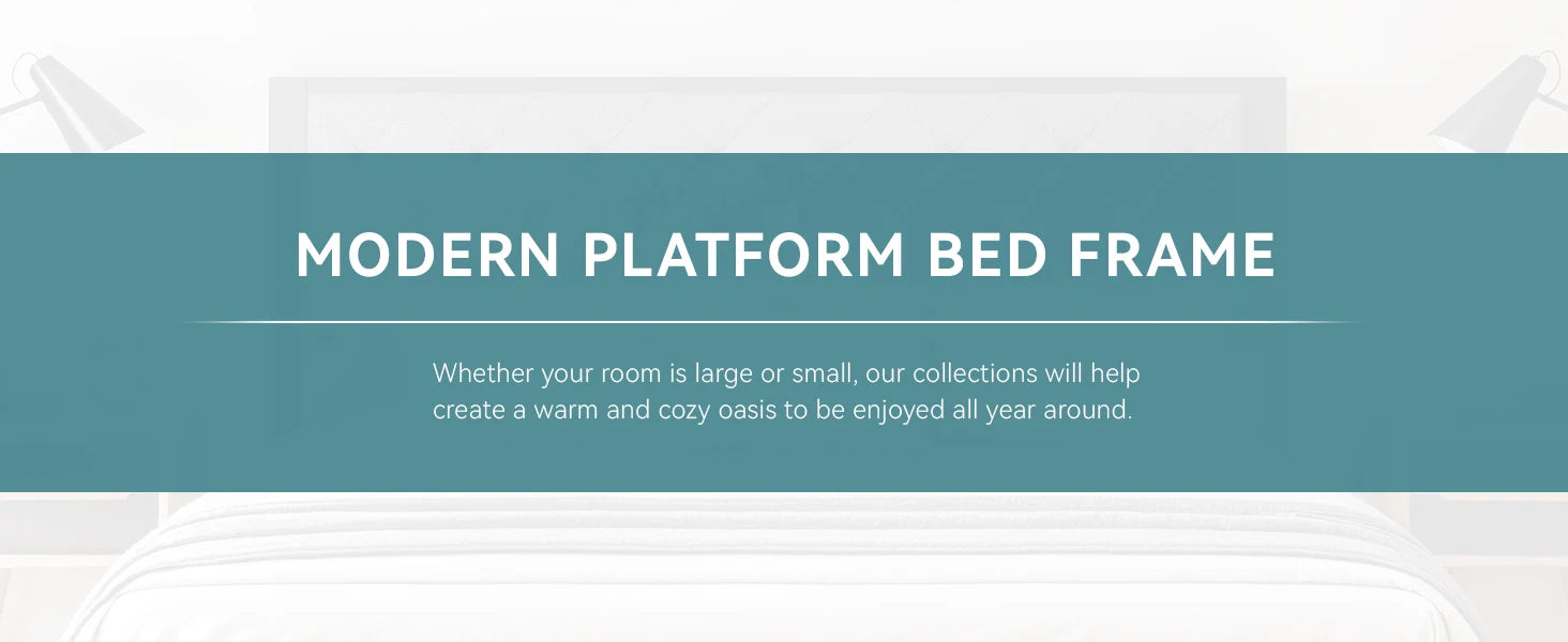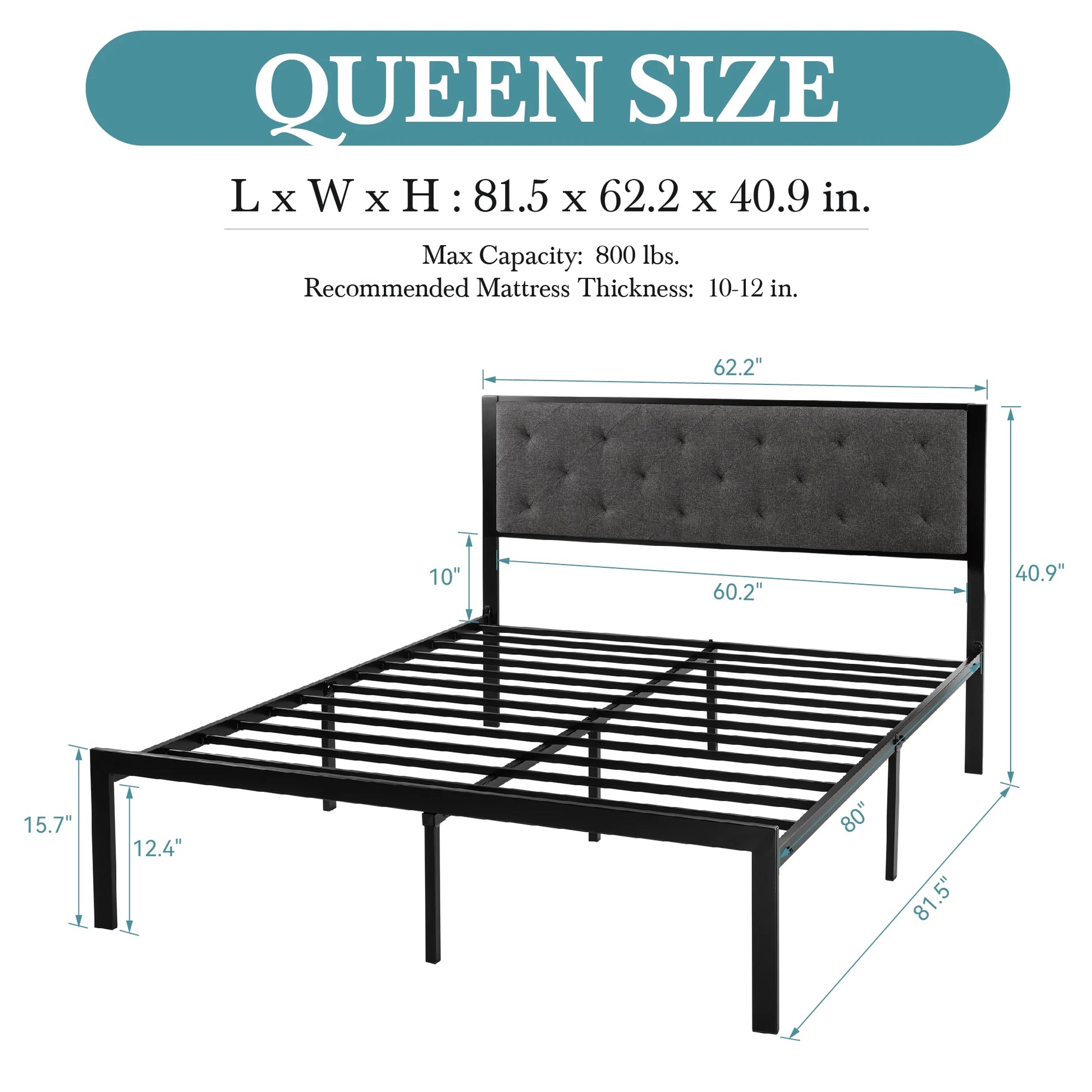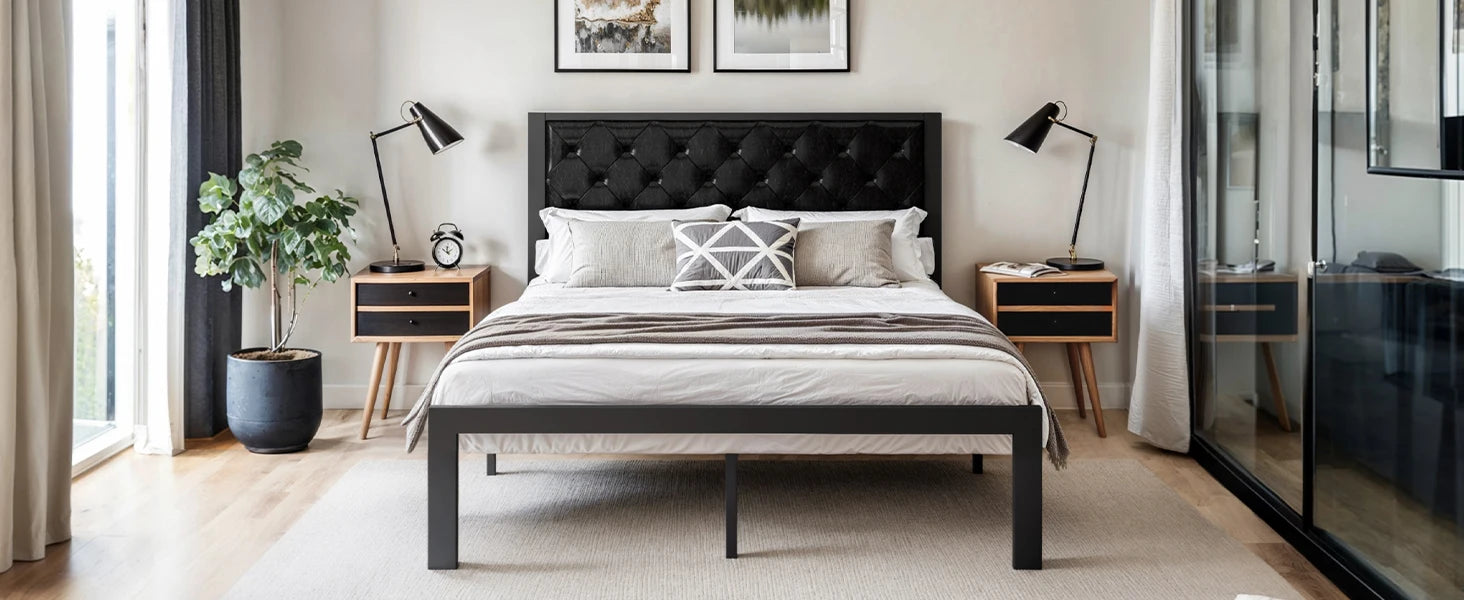 Metal Bed Frame with Upholstered Finely Stitched Headboard, Linen Fabric, Sturdy Foundation, No Box Spring Needed