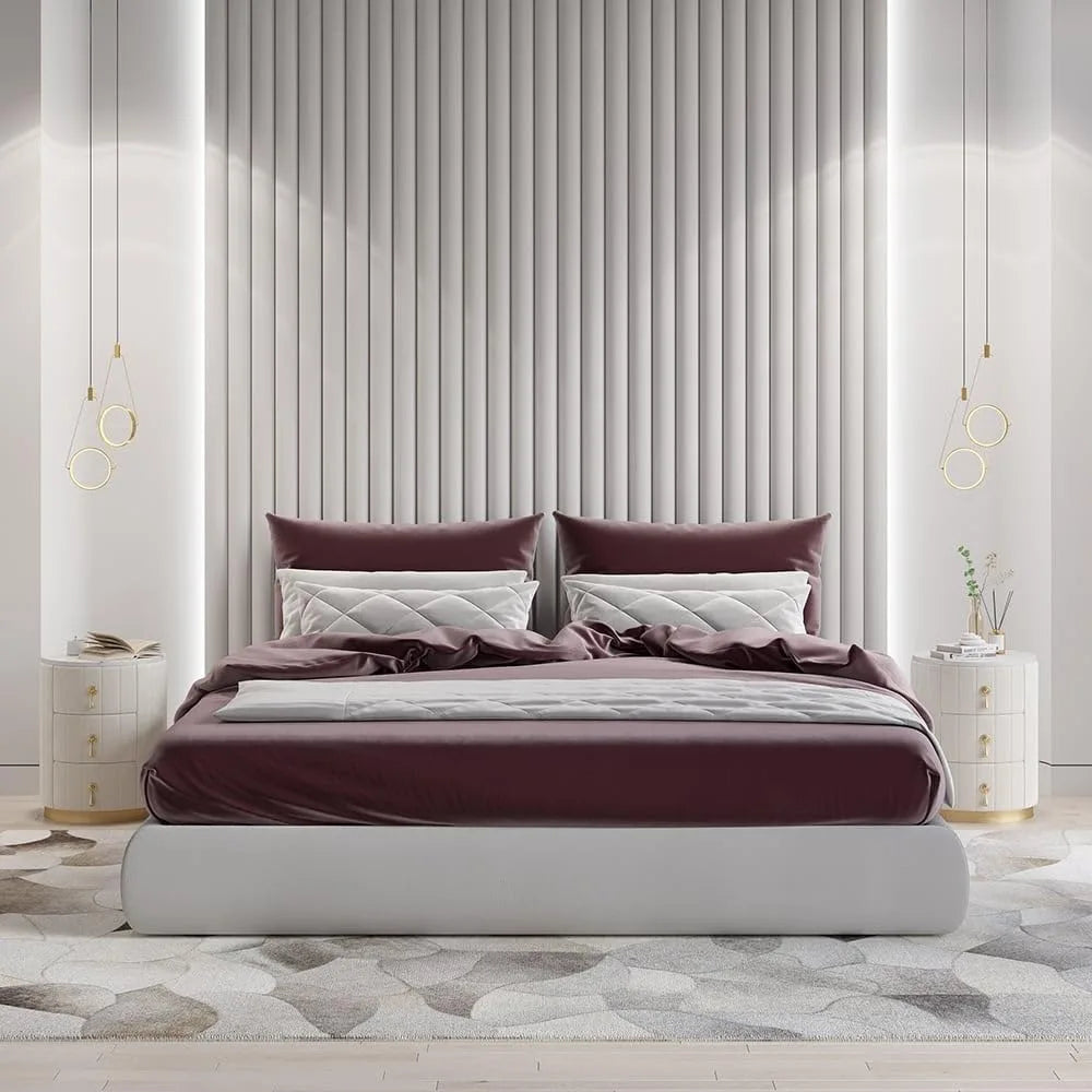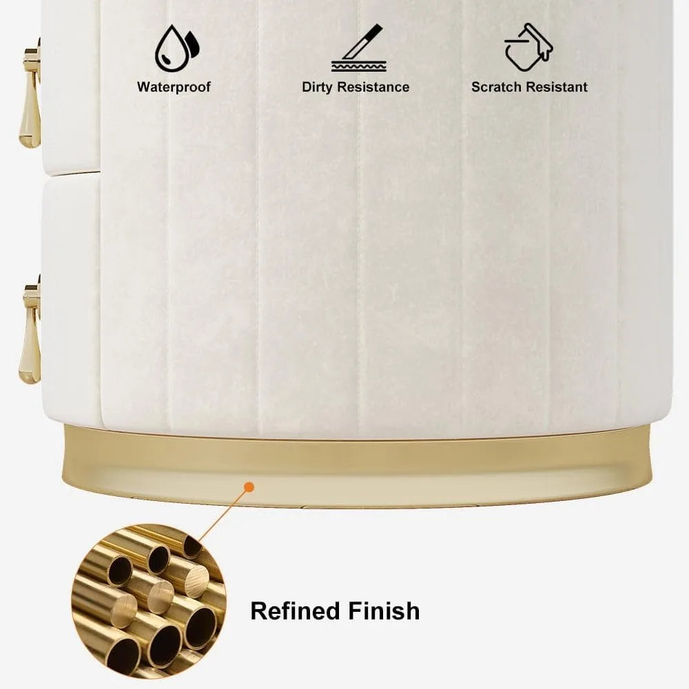 White Velvet Nightstand with Storage, Round Bedside Table with 3 Drawers, Stone Top Night Table for Bedroom